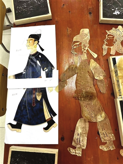 线稿与刚刚雕刻完成的皮影人物进行对比。