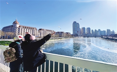 冬日的海河金钢桥畔,成群海鸥吸引游客驻足观赏。