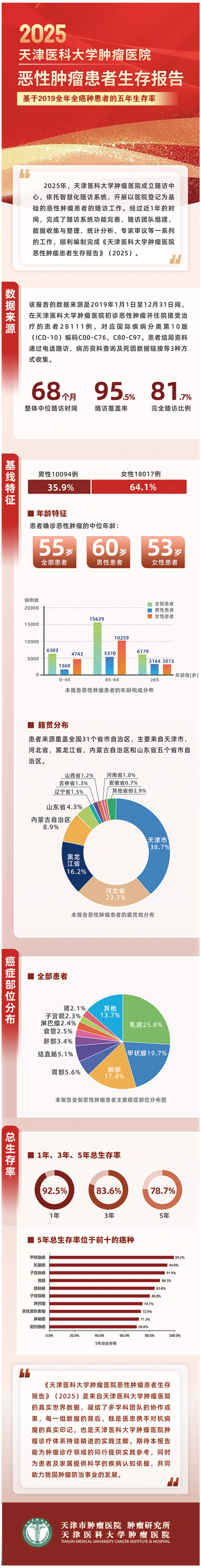 消化系统恶性肿瘤项目成功入选国家临床重点专科建设项目,中西医结合科获评国家中医药管理局中西医协同“旗舰”科室。在全国率先开展钇90放射性微球选择性内放射治疗等8项前沿医疗技术,其中术中放疗技术跻身全国前五,达芬奇机器人手术量稳居全国前列。“防、筛、诊、治、康”服务体系持续完善,医院成为国家疼痛综合管理试点、临床营养科建设示范单位,成为国家胰腺癌质控主委单位,获评12个国家肿瘤单病种质控试点单位。互联网医院上线运营。医院拥有肿瘤性疾病、临床病例、临床检验、门诊、日间医疗、医疗服务价格管理等7家市级质控中心。在国家公立医院绩效考核中连续五年保持A级水平。首次发布基于2019年初诊住院全癌种患者的五年生存报告,患者1年、3年、5年总生存率分别达92.5%、83.6%和78.7%;年龄标化5年相对生存率为66.0%,在消化系统肿瘤、肺癌、子宫体癌及乳腺癌等病种的生存数据显著优于我国同期整体水平,为学科建设提供了关键数据支撑和循证依据。