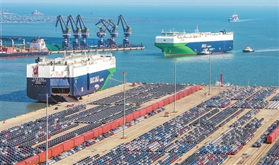1月27日,在山东港口烟台港,汽车运输船在装载出口商品车(无人机照片)。 新华社发