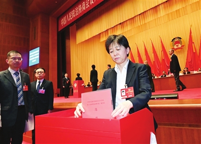 出席市政协十五届四次会议的委员投票选举。 记者 马成 许凯 王倩 摄