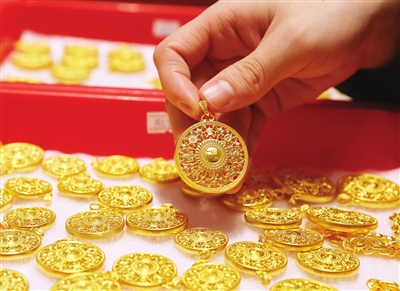 1月28日,员工在位于浙江省杭州市萧山区瓜沥镇的杭州航民百泰首饰有限公司展厅整理黄金首饰。 新华社发