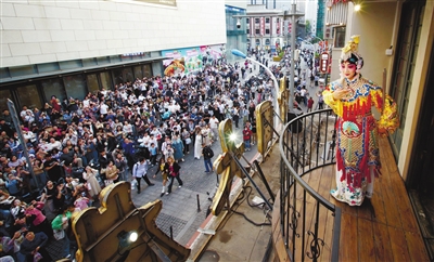 在节假日运营方面,大戏院复刻了建院初期的“游艺会”形式,推出一站式文化体验活动。观众凭一张通票,即可在剧院不同空间体验戏曲、戏法、相声、参观等多种项目,在短时间内感受天津“戏曲大码头”的多元魅力。国庆游艺会期间,剧院首度开放二楼阳台“戏剧之窗”,举办《霸王别姬》快闪活动,不仅让入场观众近距离感受虞姬的艺术之美,更吸引了隔街相望的路人驻足,通过新媒体传播形成了“破圈”效应,让中华优秀传统文化得到更广泛的传播。此外,剧院还对楼体进行了适度亮化,以暖光突出建筑纹样与招牌,营造出怀旧美好的氛围,让即使没有入场的观众也能感受到建筑的美感与戏曲的魅力。