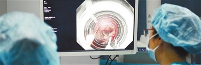 内镜检查是大肠癌、胃癌确诊金标准。图为医护团队为患者进行内镜检查。 摄影 杨阳
