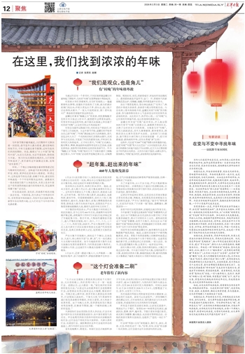 他说,让变淡的年味浓起来,需要留住与传承老年俗,积极推出新年俗。无论是新兴的“村晚”,还是传统灯会、庙会、大集焕新,都是从场景重建、参与感激活、文化符号唤醒三个层面给出了答案。