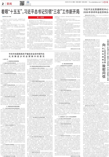 农业农村现代化关系中国式现代化全局和成色。“十四五”时期,农业综合生产能力迈上新台阶,脱贫攻坚成果巩固拓展,农民生活水平显著提高,乡村全面振兴取得明显进展。“十五五”时期是基本实现社会主义现代化夯实基础、全面发力的关键时期,要加快补上农业农村领域突出短板,加快建设农业强国。2026年是“十五五”开局之年,做好“三农”工作至关重要。要坚持以习近平新时代中国特色社会主义思想为指导,深入贯彻党的二十大和二十届历次全会精神,认真落实四中全会部署,全面贯彻习近平总书记关于“三农”工作的重要论述和重要指示精神,坚持把解决好“三农”问题作为全党工作重中之重,坚持和加强党对“三农”工作的全面领导,完整准确全面贯彻新发展理念,坚持稳中求进工作总基调,坚持农业农村优先发展,坚持城乡融合发展,锚定农业农村现代化,以推进乡村全面振兴为总抓手,以学习运用“千万工程”经验为引领,以改革创新为根本动力,提高强农惠农富农政策效能,守牢国家粮食安全底线,持续巩固拓展脱贫攻坚成果,提升乡村产业发展水平、乡村建设水平、乡村治理水平,努力把农业建成现代化大产业、使农村基本具备现代生活条件、让农民生活更加富裕美好,为推进中国式现代化提供基础支撑。
