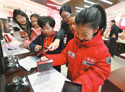 游客体验杨柳青画社套色章项目。 记者 胡凌云 摄