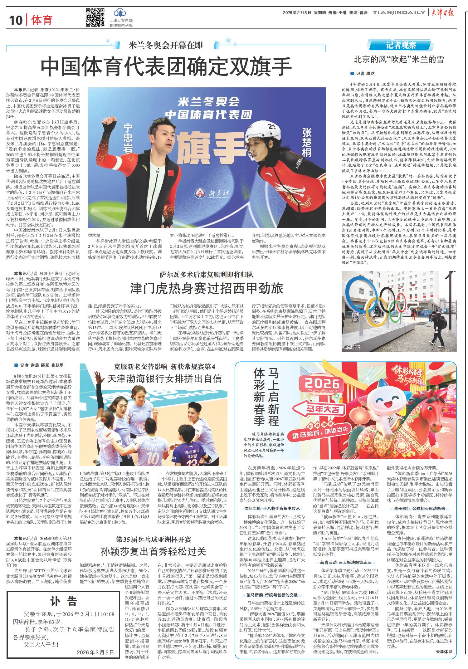 中国体育代表团确定双旗手
