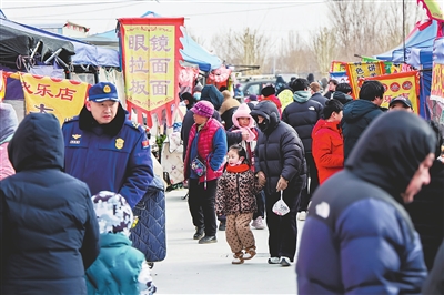 “今年,我们在保留武跷、秧歌等本地民俗表演的基础上,还引入了吴桥杂技项目,专门搭建了表演舞台,让传统民间艺术变成兼具观赏性与参与感的文旅体验。”纪剑楠表示,大集还主推“集咖、集播、集赞”打卡新玩法。其中,“集咖”能在乡村大集喝到机器人现磨的免费咖啡;“集赞”设专属摊位,老年人可积攒纪念赞章,年轻人身着明朝服饰打卡分享朋友圈即可参与活动;“集播”既邀请网络主播参与互动,也鼓励大众自发直播。“希望通过这些有趣的活动,让市民和游客全方位感受大集的热闹气氛和浓厚的年俗韵味。”她说。