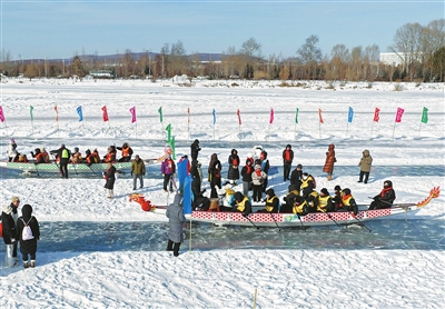 2月5日,黑龙江省大兴安岭地区首届职工冰雪运动会在加格达奇区火热开赛,30支代表队的500余名职工齐聚冰雪赛场竞技。图为参赛选手在冰上龙舟比赛中(无人机照片)。