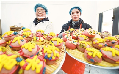河南省洛阳市西工区红山街道枣园社区花馍工坊内,工人展示制作好的花馍。