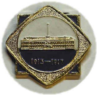 周恩来同志青年时代在津革命活动纪念馆开放后,曾发行过不同版式的金属纪念章。图案多以周恩来头像为主,配以纪念馆建筑外观,且皆采用金色,显得庄重而和谐。纪念章上雕铸的纪念馆建筑主立面图案,虽然不可能像纸质纪念品印刷得那样线条细腻、色彩丰富,但对建筑基本形制及其中西合璧的特点却也呈现得十分明确。这座建筑为二层砖木结构,外立面为传统青砖镶嵌红砖饰面。首层设矩形方窗,二层设有连续罗马式半圆拱券窗。主入口突出形成巨大门厅,正中跨一座拱形大门。屋顶正中立断裂式山墙,中间立旗杆,山墙下方嵌有校名横匾。纪念章在表现这座建筑主立面时,构图简约却不失精致,色彩简明而搭配得当,展现出前计算机时代金属材质设计特有的艺术美感。