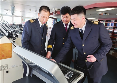 天津港引航中心引航员孙勃(右一)和许钦平(左一)在“中远海法”轮驾驶室与船长交流。