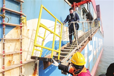 孙勃(上)通过货轮的舷梯和软梯下到拖轮上,结束出港货轮的引航任务。