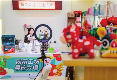 创富工坊里年轻人正直播带货,将第六埠村的品牌农产品推向全国。