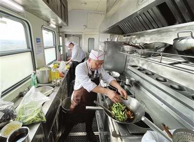 采访中,记者发现每当提起餐车后厨和菜品时,陈宇眼中都会闪烁着明亮的光,脸上挂着藏不住的笑容。“我虽然不是科班出身,但跟着老师傅学、看视频琢磨做菜,为的就让大家在列车上吃得开心。”陈宇说。
