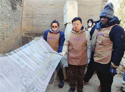 近日,蓟州古城的鲁班庙因为一群大学生的到来而格外热闹。放置在正殿里的一处脚手架上,来自尼日利亚的留学生班纳正聚精会神地进行彩画摹拓,非物质文化遗产代表性项目古建油漆彩绘代表性传承人李燕肇在一边悉心辅导。这一幕来自由蓟州区文化和旅游局与北京建筑大学鲁班国际书院联合举办的“中国营造·古建筑彩画”冬令营,30余名学生在这座供奉着“祖师爷”鲁班的古建筑中,开启了一场跨越千年的匠心对话。