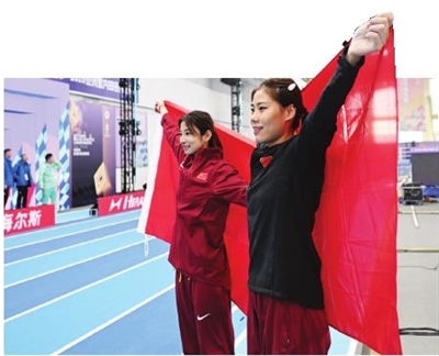 中国队牛春格(右)获得女子撑杆跳高金牌,危菱侠夺得铜牌。