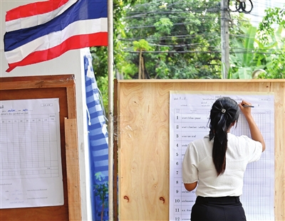 图为工作人员在泰国首都曼谷的一处计票中心统计选票。