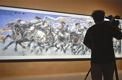 媒体记者在中国美术馆拍摄展出的绘画作品《逐日图》。 新华社发