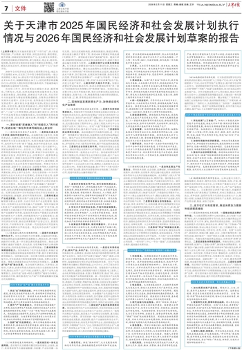 (二)经营主体和经济大区竞相发展。一是国企核心功能支撑向优。国企改革深化提升行动圆满完成,泰达、城投、轨道、津融等国企集团通过重组优化资产结构,国资产业发展母基金设立运营。市属国企利润总额增长7.4%,非金融企业利润总额增速列全国第7位。二是民营经济健康成长。提请市人大常委会审议通过民营经济促进条例,优化政企互通服务信息化平台和民营企业常态化沟通交流机制,成功举办2025中国民营企业投融资洽谈会,精心组织“国企央企民企握手对接”等服务民企系列活动。民营经济增加值占全市生产总值比重达37.7%。三是经济大区贡献作用持续显现。6个经济大区一般公共预算收入增速均好于全市平均水平,滨海新区地区生产总值增速今年以来始终保持快于全市,高质量发展支撑引领作用充分发挥。