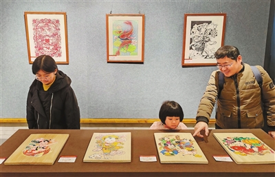 一幅版画前,市民郭月陪着上初中的女儿细细品读。“用版画的形式表现年画主题,立体感很强。这些作品本土气息浓郁,孩子们把年画经典元素和自己的创意融合在一起,特别有趣。”郭月说。