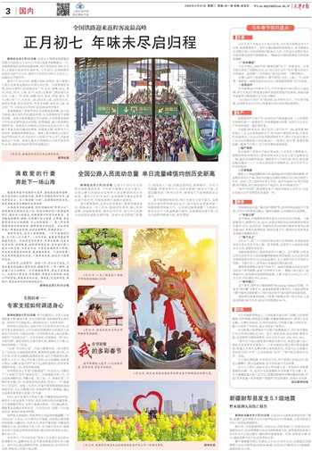 各地铁路部门多措并举应对返程客流高峰,加大运力投放,落实便民利民惠民举措,全力保障旅客平安顺利返程。国铁太原局集团公司太原南、大同南等客流较大车站动态增加进出站安检、验票通道,减少旅客排队等候时间。国铁武汉局集团公司各车站在进出站口、扶梯口等重点部位铺设防滑垫、设置提示牌,安排专人引导防护,保障旅客乘降安全。国铁上海局集团公司加开旅客列车605列,杭州东站引入AI助手“杭小东”,为旅客提供出行方案。国铁乌鲁木齐局集团公司加开旅客列车36列,安排23列动车组列车重联运行。