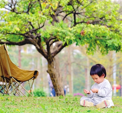 2月23日,一名小朋友在广西南宁市南湖边绿地上玩耍。