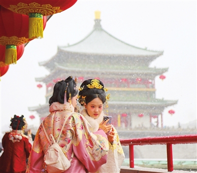2月23日,游客在陕西省西安市钟楼旁赏雪拍照。