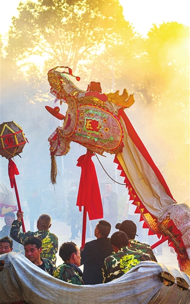 2月22日,村民在湖南省娄底市双峰县杏子铺镇涟水村舞火龙。