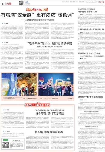 新春佳节,津沽大地年味正浓。古文化街的宫灯映照游人笑脸,天津站的钟声承载团圆期盼,社区里的欢声笑语勾勒幸福模样。当千家万户围炉夜话、共赴新春之约时,有一抹藏蓝色始终穿梭在人流车流中,用一次次俯身相助、一幕幕暖心接力,将“平安”二字写进万家灯火,让这个春节假期既有满满的“安全感”,更有浓浓的“暖色调”。