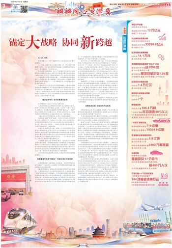 栉风沐雨、协同奋进。如今,京津冀协同发展正以全新格局站上新的历史起点。《现代化首都都市圈空间协同规划(2023—2035年)》(以下简称《规划》)公布,这是目前我国唯一一个拥有两个直辖市的都市圈。一纸规划绘就发展新蓝图——天津武清区纳入通勤圈、天津全域纳入功能圈、高质量谱写京津“双城记”……一系列精准布局,为天津锚定新坐标、赋予新使命。