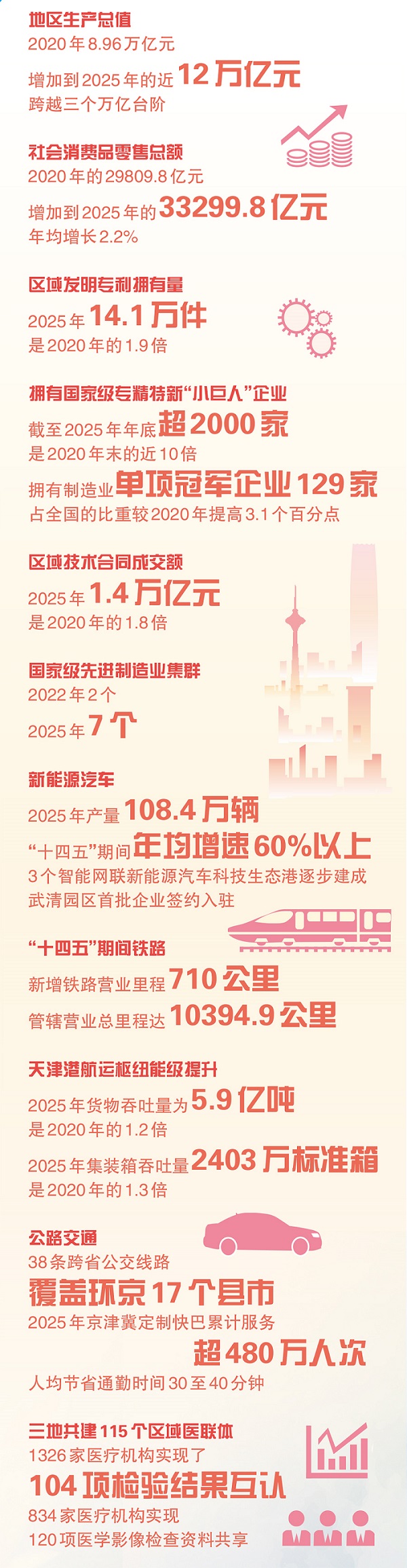 生态环保和公共服务的“暖心牌”持续擦亮。天津与京冀深化生态环保联防联控联治,共同守护绿水青山。2025年天津优良天数比例达77%,875平方公里湿地、736平方公里绿色生态屏障区得到有效保护。共建共享让民生福祉不断增进,33所天津中小学与京冀学校开展深度交流合作,京津冀异地就医“免备案”全面实现,社保卡“一卡通”覆盖交通出行、旅游景区等多个便民应用场景,职称资格互认、跨区域养老补贴等政策落地实施。越来越多协同成果,正惠及千家万户。