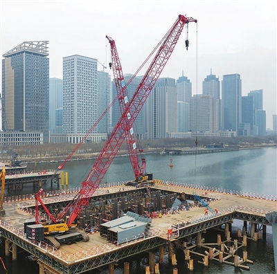 春节假期后,滨海新区安阳桥、于新桥分别开展围堰降水、主墩塔柱施工,全力攻坚,确保2027年具备通车条件。图为施工中的安阳桥。 记者 赵建伟 摄