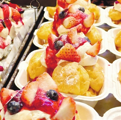 一位面包师表示,为了提升面包“打卡价值”,他们努力把面包做得漂亮精致,比如在牛角包上面点缀奶油、水果、巧克力酱,看上去饱满诱人。