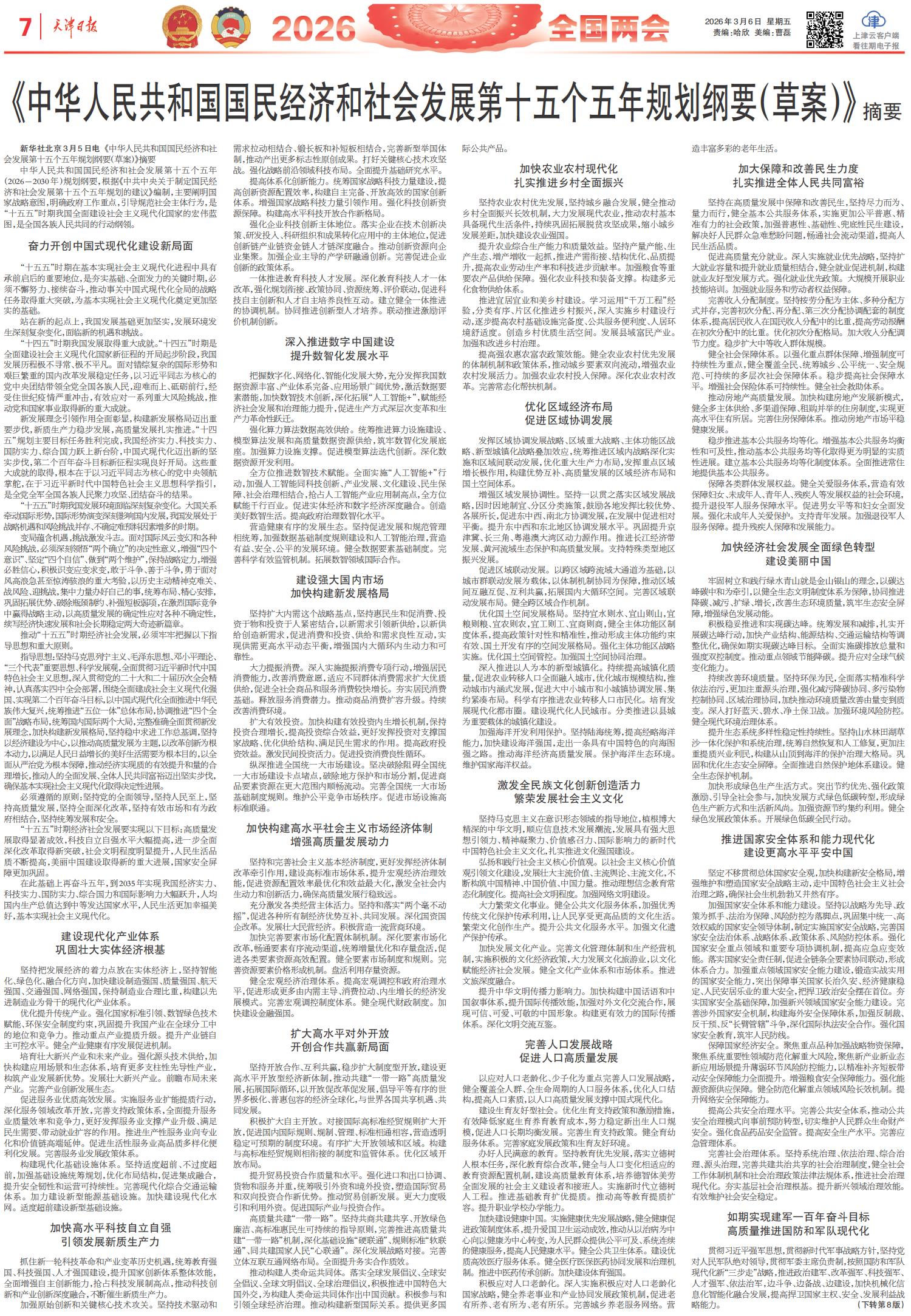 《中华人民共和国国民经济和社会发展第十五个五年规划纲要(草案)》摘要