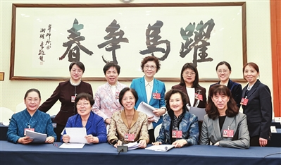 昨日,天津代表团女代表参加完小组讨论会,在会场合影纪念“三八”国际妇女节。