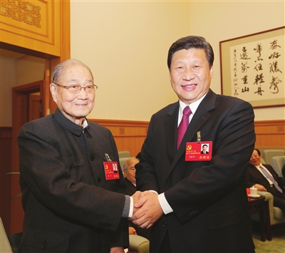 二〇一二年十一月十四日,在党的十八大闭幕前,习近平同志同宋平同志在一起。