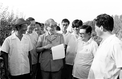 1990年7月中下旬,宋平同志(前左二)来到内蒙古自治区巴彦淖尔市临河区马场地村了解基层党支部建设情况。