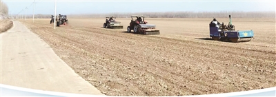 津沽大地奏响春耕序曲,西青区杨柳青镇大柳滩村的金色麦浪家庭农场里热火朝天。三台播种机在平整的田畴上往来穿梭,铁犁划开泥土,一粒粒饱满的麦种精准入土,覆土、镇压一气呵成。