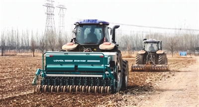 伴随着机器的轰鸣声,几台搭载了无人驾驶辅助系统的播种机沿着预设路线精准作业。这些播种机通过北斗系统实现厘米级定位,松土、播种、施肥、覆土等工序“无缝衔接”。