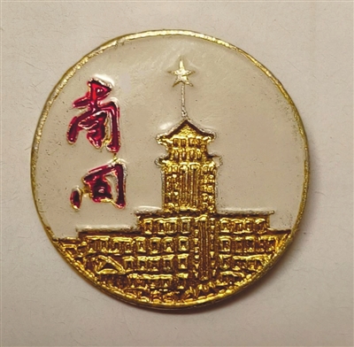 带有建筑元素的徽章,一般为建校若干周年纪念或为某项活动而发行。这类徽章尺幅较小但形状各异,有圆角三角形、类矩形、“NK”大写字母缩写外形等。章面显著位置标记“南开”字样,有些辅以星星图案或“1919”字样作为装饰。画面中呈现的建筑,多为南开大学主楼外景,图案或繁或简。主楼位于八里台校区中南部,1962年建成,时为天津规模最大的高校建筑。主楼为对称结构,坐北朝南,雄伟挺拔。整体采用高低层结合形式,主体6层,局部12层,松香石外墙,屋顶设标志性塔楼。主楼门前有广场,几十年来一直作为毕业及大型活动的集体合影处。