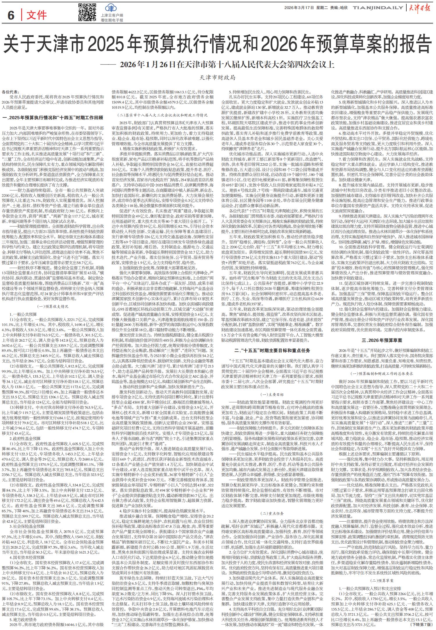 关于天津市2025年预算执行情况和2026年预算草案的报告