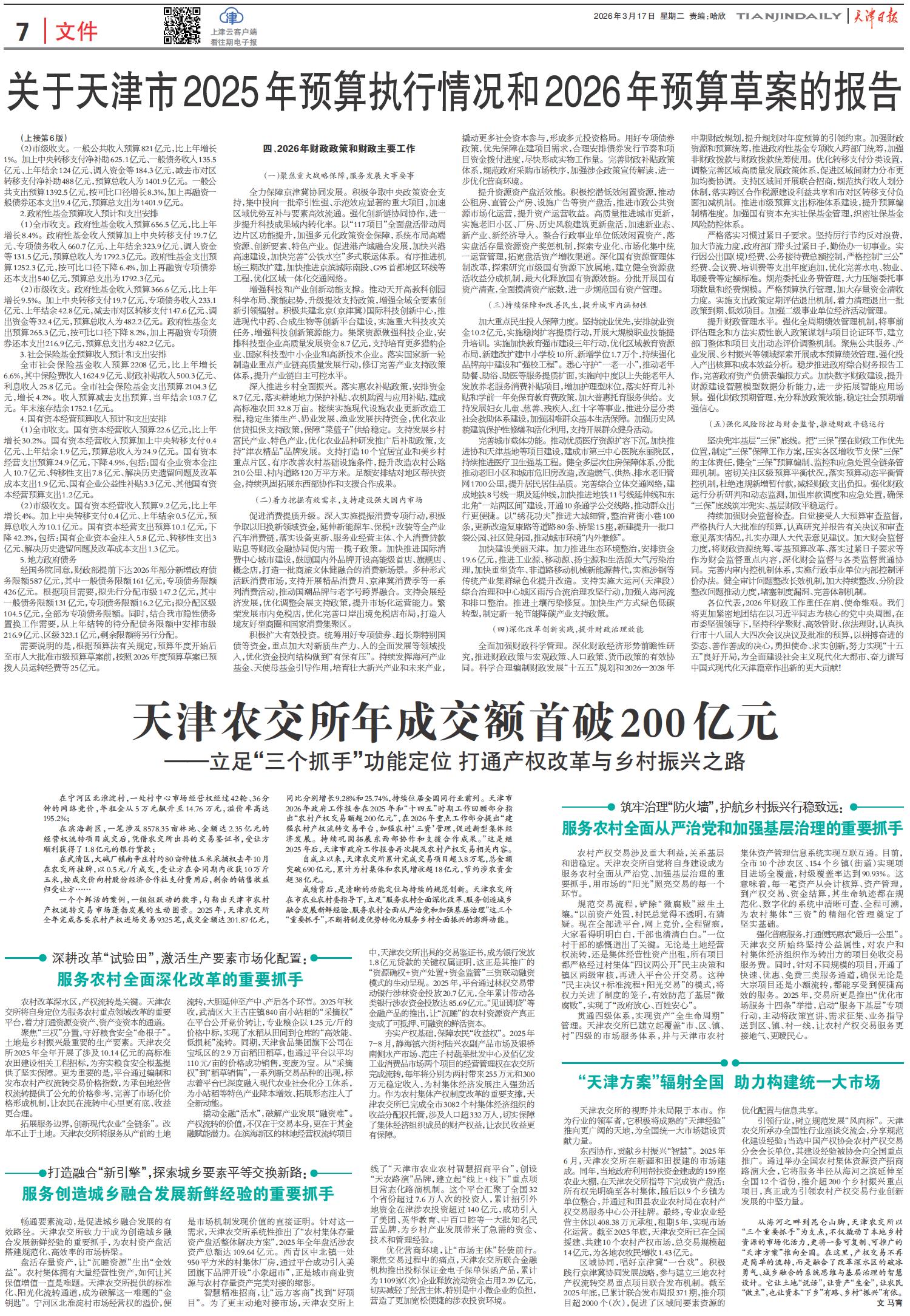 关于天津市2025年预算执行情况和2026年预算草案的报告