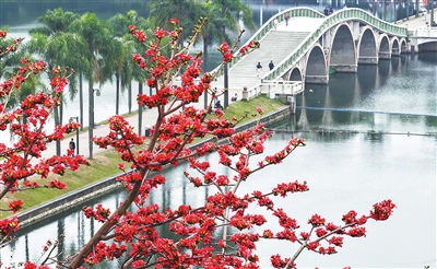 图为广西南宁市南湖岸边盛放的木棉花(3月19日摄,无人机照片)。