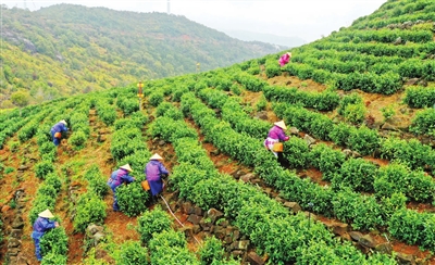 3月21日,采茶工在浙江省玉环市石峰山火山茶园里采摘春茶。茶园新芽勃发,生机盎然。 新华社发