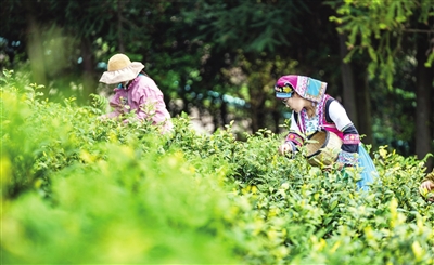 4月2日,茶农在六盘水市六枝特区月亮河彝族布依族苗族乡的茶山采摘春茶。