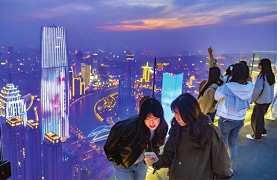 和平区津湾云顶成为热门打卡地,游客登上300米高空观景平台,俯瞰海河两岸。 记者 吴迪 摄