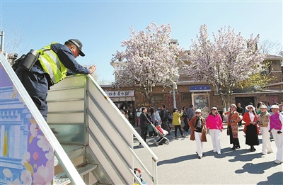 4月初的天津大理道花开成海,海棠花节游人如织。在这片粉色浪漫中,一个特殊的“拍照机位”悄然走红——它不是最美街角,也不是影楼的外拍场地,而是天津公安民园景区治安派出所临时设立的高台执勤岗。