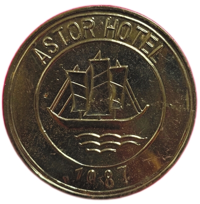 坐落在海河与解放北路之间的利顺德大饭店,始建于1863年,是天津开业最早的著名外资饭店,是近代以来中国政治、经济、外交活动的重要场所,很多中外名人曾于此下榻,很多中外条约曾于此签订。1987年发行的一枚利顺德大饭店(海河边的新厦)开业纪念大铜章,铸有该饭店的店徽:以一艘三桅帆船为核心图案,象征“一帆风顺”,寓意饭店在历史长河中乘风破浪,持续发展。这一设计不仅呼应了其作为百年酒店的航海文化渊源,也体现了中西合璧的人文底蕴。
